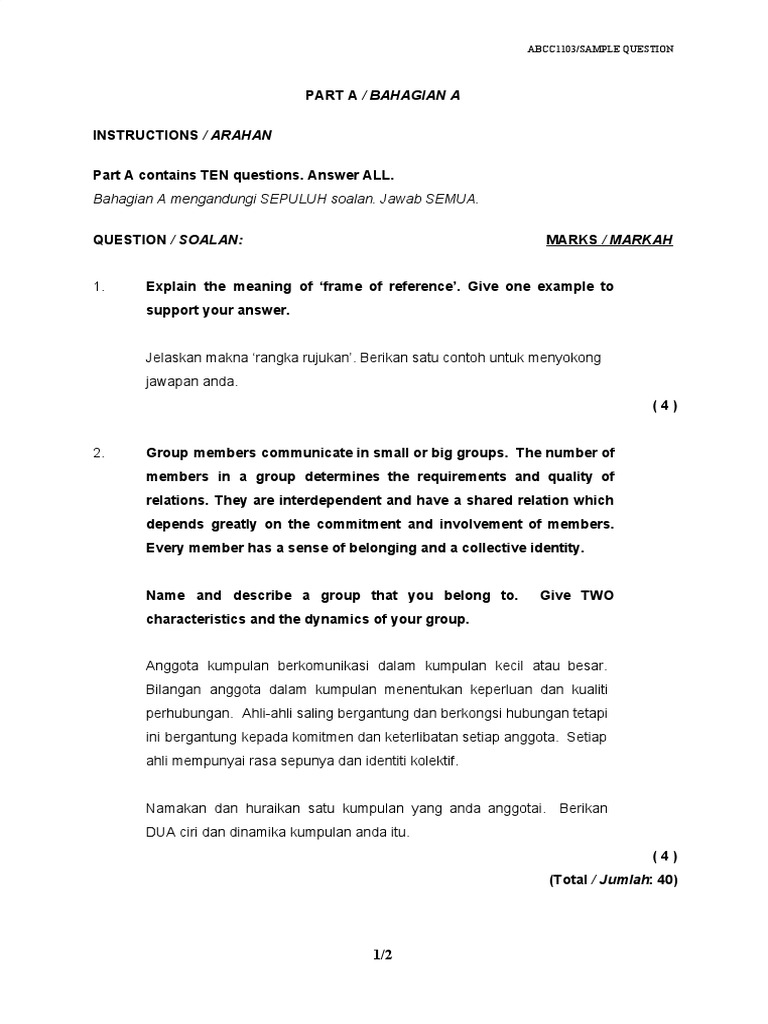 2 Total 75 30 QN Question Number NS Nombor Soalan ABCC1103 -. SAMPLE QUESTION ABCC1103 INTRODUCTION TO COMMUNICATION SEQdoc - ABCC1103SAMPLE QUESTION PART A BAHAGIAN A INSTRUCTIONS ARAHAN Part A contains. Iden琀椀琀椀 produk dan pembekal tarikh penyediaantoksikologi maklumat ekologi maklumat pelupusan.