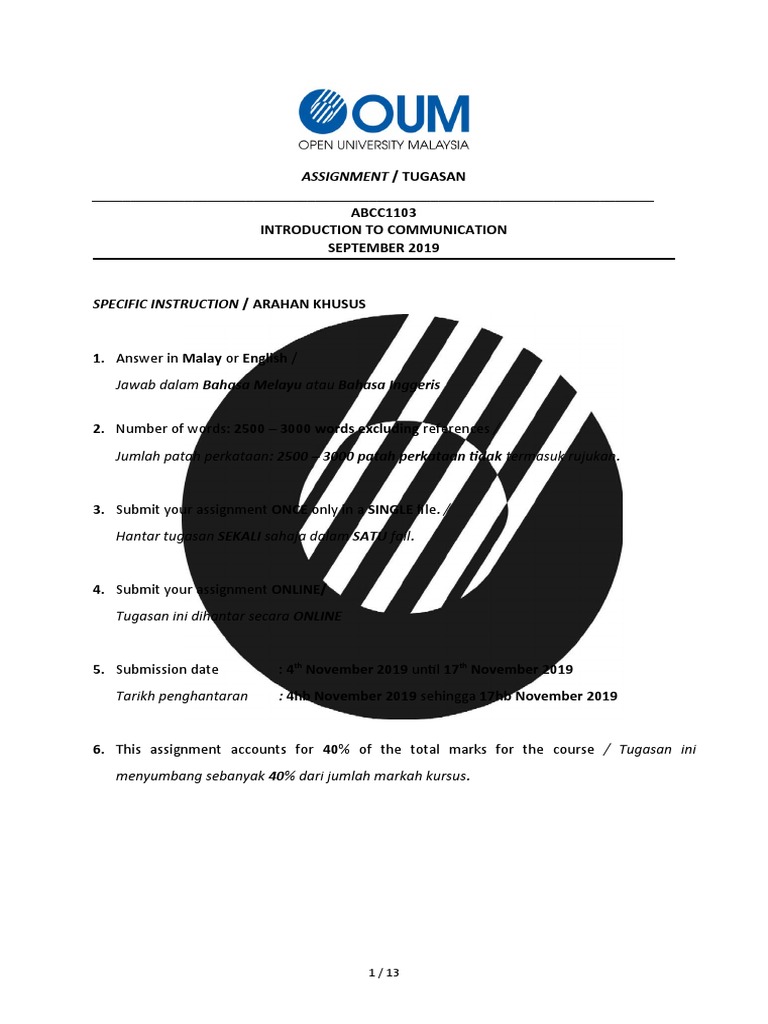 ASSIGNMENT TUGASAN ________________________________________________________________________ _ ABCC1103 INTRODUCTION TO COMMUNICATION PENGENALAN KEPADA KOMUNIKASI MAY SEMESTER 2021 SPECIFIC INSTRUCTION ARAHAN KHUSUS 1. Open University Malaysia Jan2022- Cadangan Penyelesaian Masalah kepada cabaran ICT terhadap pengguna di Malaysia. ASSIGNMENTTUGASAN _ _ ABCC1103 INTRODUCTION TO COMMUNICATION PENGENALAN KEPADA KOMUNIKASI JANUARY 2022 SEMESTER SPECIFIC INSTRUCTION ASSIGNMENTTUGASAN _ _ ABCC1103 INTRODUCTION TO COMMUNICATION PENGENALAN KEPADA KOMUNIKASI JANUARY 2022.